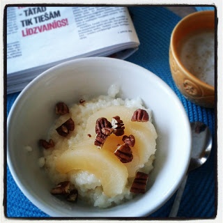Сварить рис по полуготовности, добавить сгущенку. Варить до мягкости риса. Добавить груши. Порезанные на маленькие кусочки и посыпать орехами.